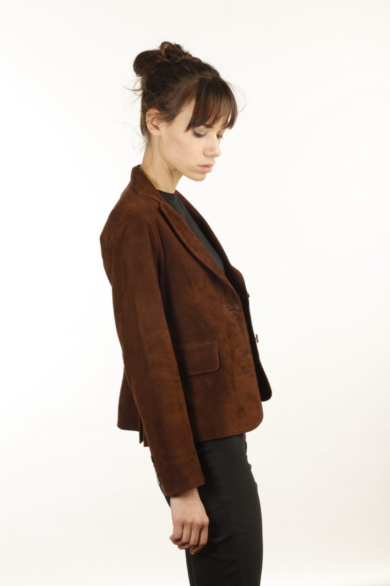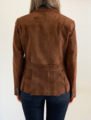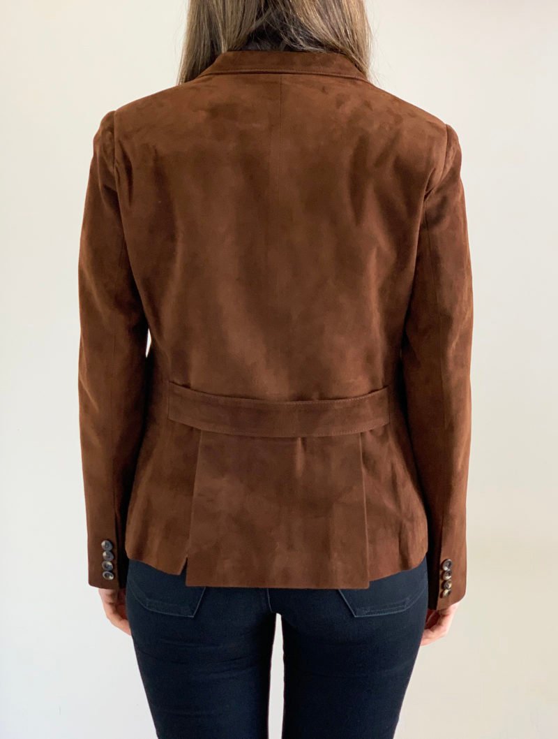 Blazer con doble abotonadura, cuello y solapa. Dos bolsillos al frente con tapa y un bolsillo superior de vista. La espalda lleva dos tajos y martingala. Manga tipo sastre con detalle de 4 botones. Terminación interior con forro de raso a tono.