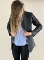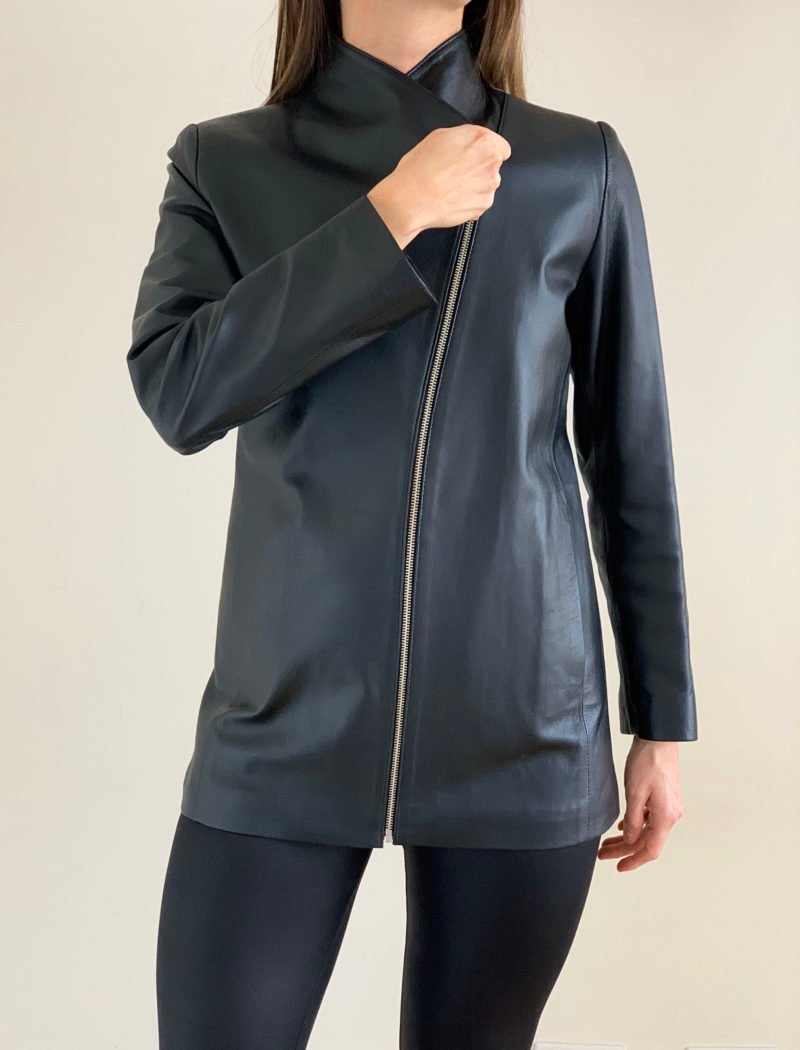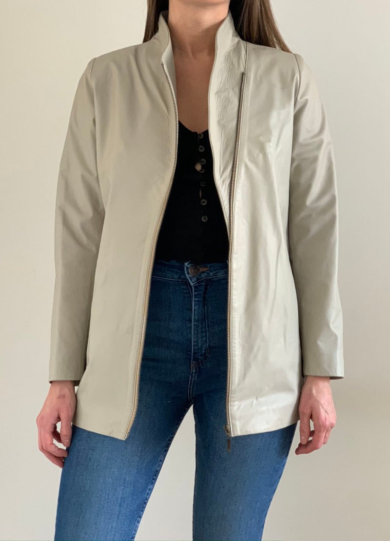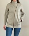 Campera con cierre delantero cruzado y dos bolsillos ojal. Doble opción de cierre con cuello abierto y solapa o cuello cerrado. Bolsillos laterales. Terminación interior con forro de raso suave y ligero.