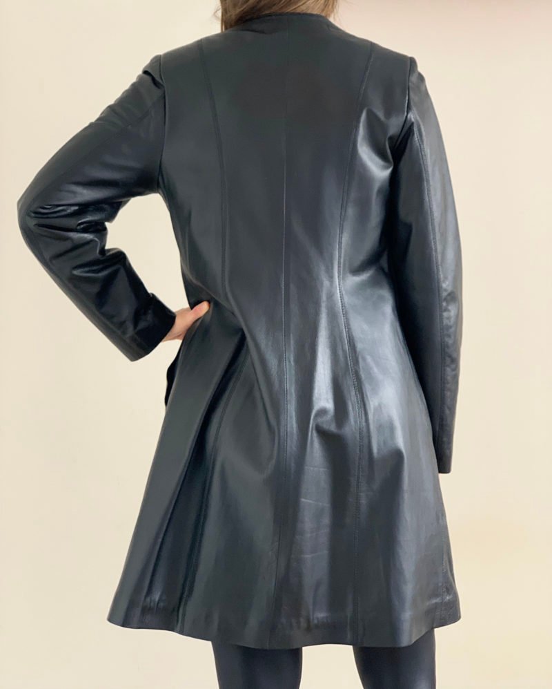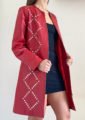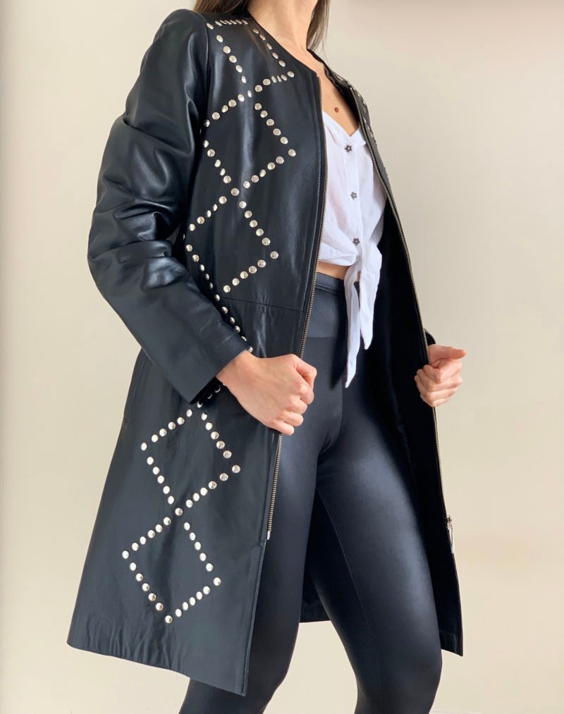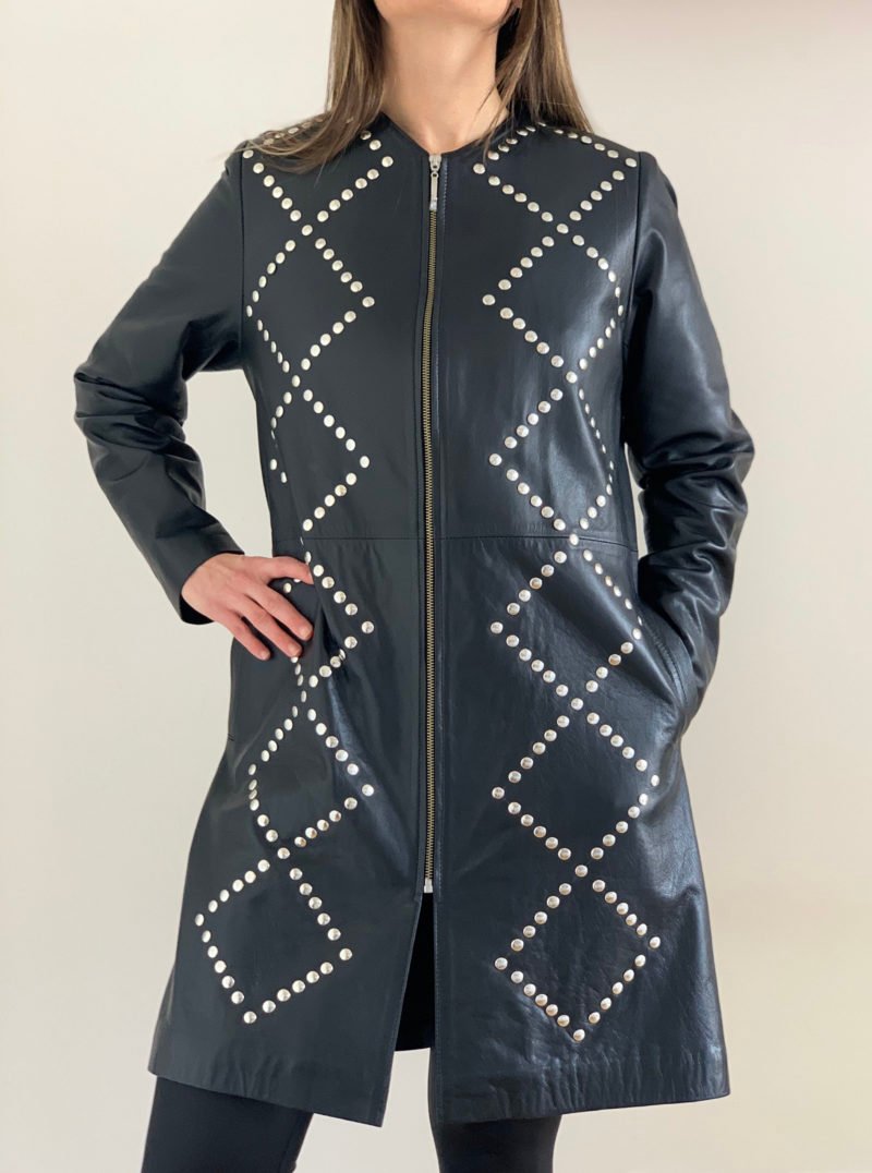 Tapado con cuello redondo con tachas plateadas en rombo. Con bolsillo laterales ojal. Terminado interior con forro de raso suave y ligero.