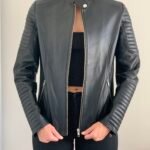 Campera estilo rockera entallada con cierre cruzado plateado, cuello solapa y broches plateados. Lleva dos bolsillo laterales con cierre plateado y mangas con cierre en los puños.